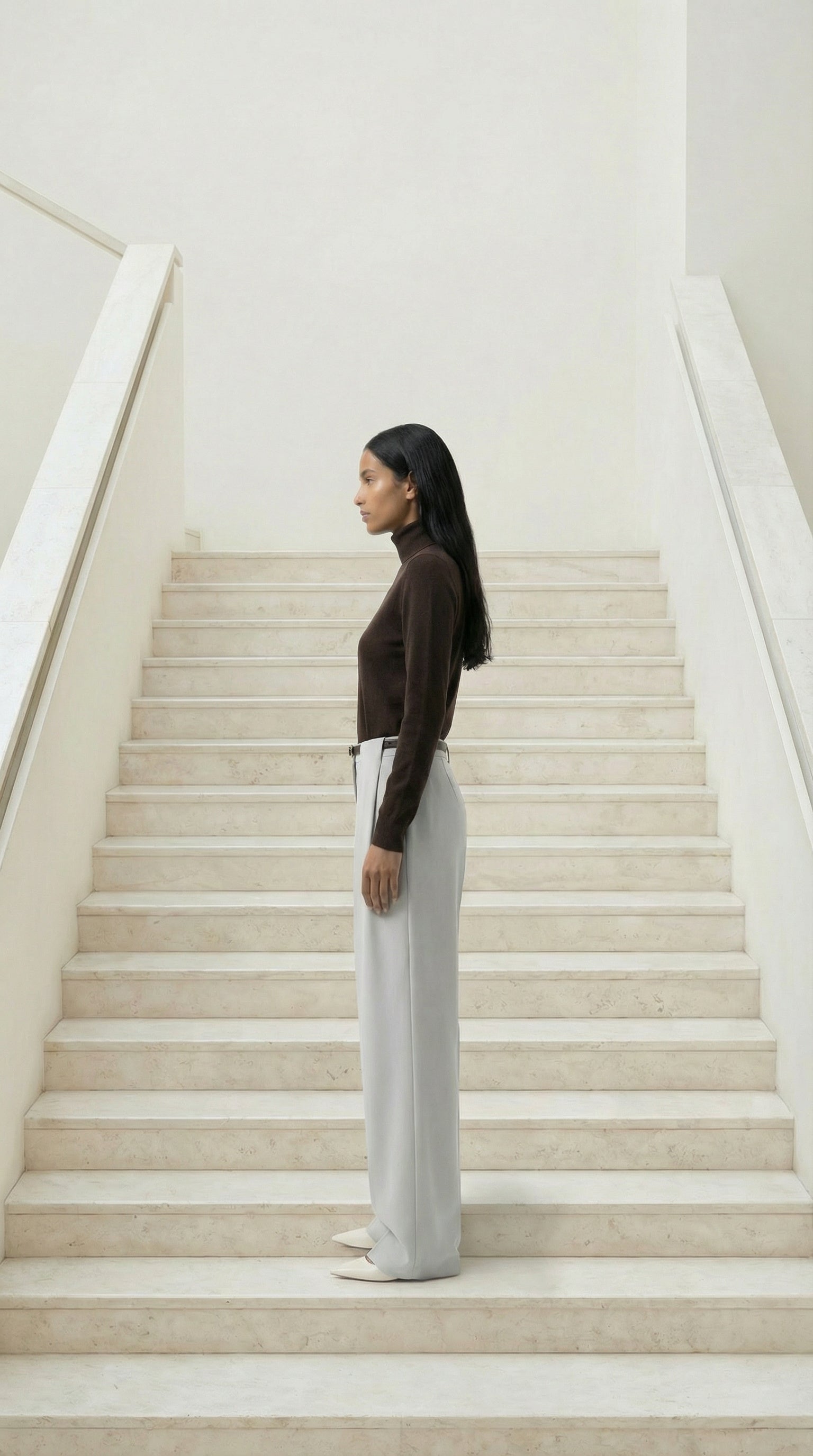 Pantalon large à taille haute en gris perle. Confectionné dans un tissu haute qualité fluide au tombé impeccable, il présente des pinces sur le devant pour un volume maîtrisé et un pli central allongeant la jambe. Une pièce intemporelle du vestiaire "quiet luxury", idéale pour une silhouette élancée et sophistiquée.