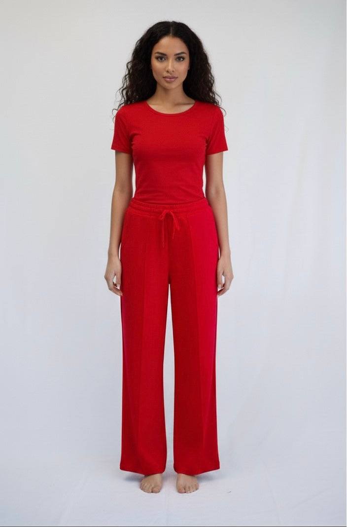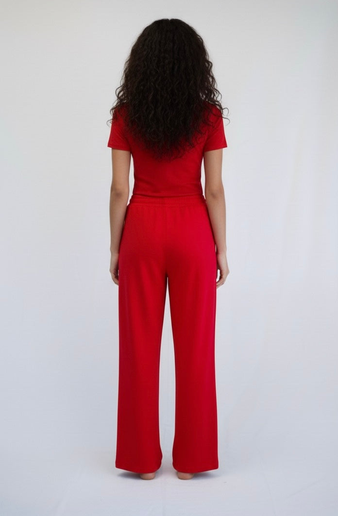 Ce pantalon en rouge vif , principalement fabriqué en coton peigné, offre un confort exceptionnel et une durabilité optimale grâce à son tissu doux et respirant, conçu pour résister aux bouloches.